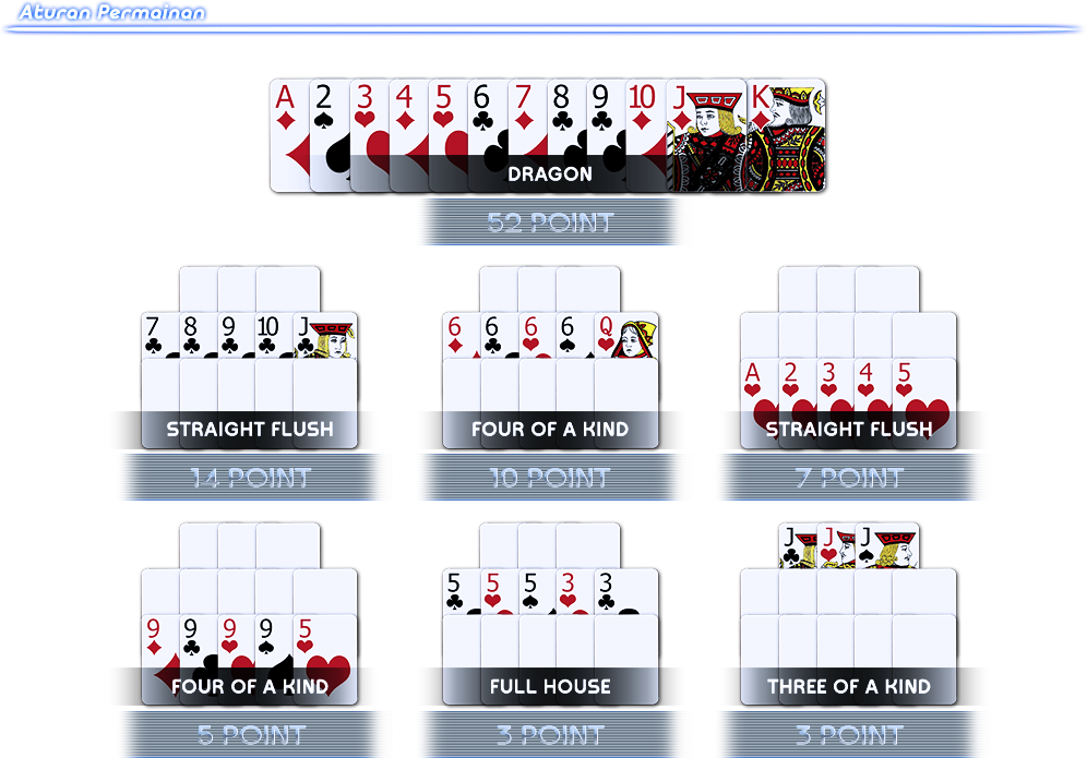 Dalam case “Seri” : Pemain yang memiliki angka tertinggi dalam urutan tersebut yang akan menang. Note : Kartu Ace dapat digunakan sebagai kartu tertinggi ataupun terendah dalam urutan. Dan hanya kartu Ace yang dapat digunakan dalam kombinasi berikut: