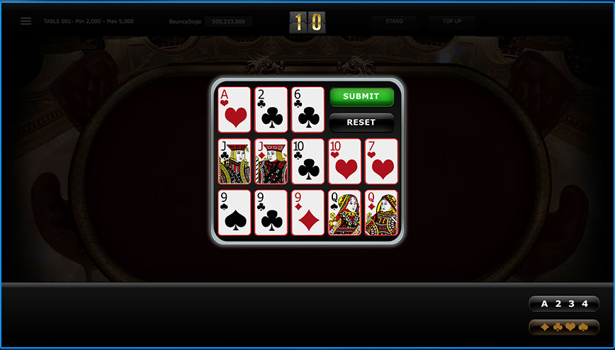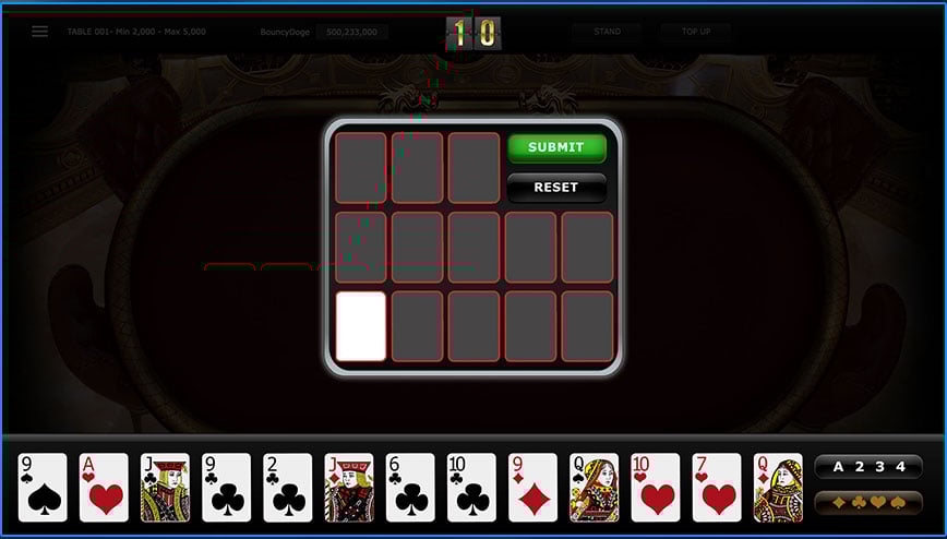 Di pemainan ini setiap pemain akan menerima dua kartu di awal permainan setelah itu akan di bagikan lagi satu kartu sehingga pemain akan memegang masing-masing 3 kartu di tangan dan pemain yang memiliki kombinasi jumlah nilai tertinggi akan memenangkan permainan.