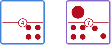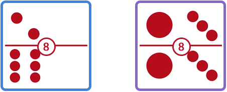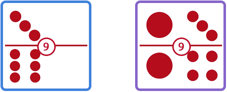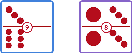 Dalam permainan ini nilai kartu anda disebutkan dengan cara Sisi Kiri : Sisi Kanan. Lihat contoh berikut untuk details, angka dalam lingkaran putih merepresentasikan nilai kedua kartu sisi kiri dan kanan.