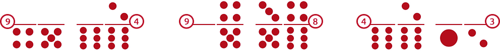 Perlu diingat bahwa nilai tertinggi dalam penghitungan ini adalah 9, jika jumlah titik lebih besar dari 10, 20, atau 30, maka angka yang diambil adalah digit terakhir hasil penjumlahannya. Berikut contoh cara menghitung kartu-kartu domino: