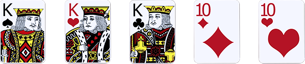 Full House: Tiga kartu berperingkat sama, dan dua kartu berperingkat sama dari peringkat yang lain.
