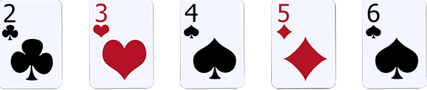 Catatan: Ace bisa digunakan sebagai puncak atau dasar urutan, dan merupakan satu-satunya kartu yang bisa digunakan demikian. A, K, Q, J, dan Sepuluh adalah straight tertinggi (Ace high); 5,4,3,2,A adalah straight terendah (Five high).