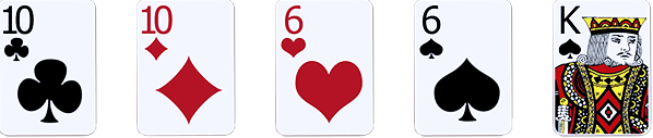 Two pair: Dua kartu berperingkat sama, dua kartu berperingkat sama dari peringkat yang lain, dan satu kartu sampingan.